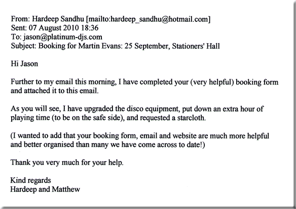 Hardeep - Wedding Reception September 2010 Hi Jason, Further to my email this morning, I have completed your (very helpful) booking form and attached it to this email. As you will see, I have upgraded the disco equipment, put down an extra hour of playing time (to be on the safe side), and requested a starcloth. (I wanted to add that your booking form, email and website are much more helpful and better organised than many we have come across to date!) Thank you very much for your help. Kind regards Hardeep and Matthew |
