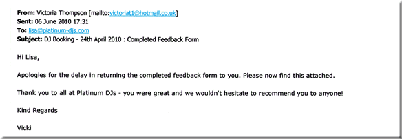 Thompson - Wedding Reception April 2010 Hi Lisa, Apologies for the delay in returning the feedback form to you. Please now find this attached. Thank you to all at Platinum DJs - you were great and we wouldn't hesitate to recommend you to anyone! Kind Regards, Vicki |