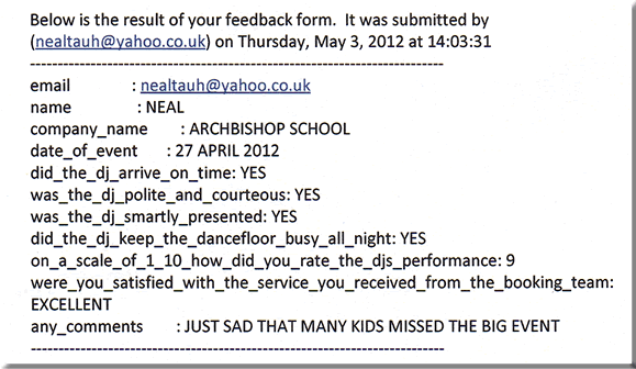 | email: nealtauh@yahoo.co.uk name: Neal company name: Archbishop School date of event: 27 April 2012 did the dj arrive on time: Yes was the dj polite and courteous: Yes was the dj smartly presented: Yes did the dj keep the dancefloor busy all night: Yes on a scale of 1 to 10 how did you rate the djs performance: 9 were you satisfied with the service you received from the booking team: Excellent any comments: Just sad that many kids missed the Big Event |