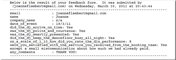 joanneflambert@gmail.com name: Joanne company name: n/a date of event: 19/3/11 did the dj arrive on time: Yes was the dj polite and courteous: Yes was the dj smartly presented: Yes did the dj keep the dancefloor busy all night: Yes on a scale of 1 to 10 how did you rate the djs performance: 8 were you satisfied with the service you received from the booking team: Yes except a small miscommuniation about how much we had already paid any comments: THANK YOU! |