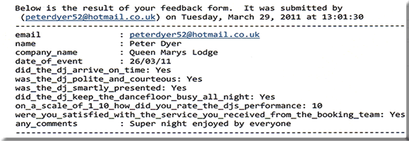 peterdyer52@hotmail.co.uk name: Peter Dyer company name: Queen Marys Lodge date of event: 26/03/11 did the dj arrive on time: Yes was the dj polite and courteous: Yes was the dj smartly presented: Yes did the dj keep the dancefloor busy all night: Yes on a scale of 1 to 10 how did you rate the djs performance: 10 were you satisfied with the service you received from the booking team: Yes any comments: Super night enjoyed by everyoneer52 |