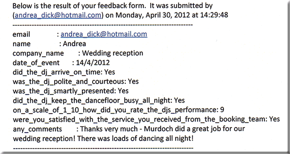 andrea_dick@hotmail.com name: Andrea company name: Wedding Reception date of event: 14/4/12 did the dj arrive on time: yes was the dj polite and courteous: Yes was the dj smartly presented: Yes did the dj keep the dancefloor busy all night: Yes on a scale of 1 to 10 how did you rate the djs performance: 9 were you satisfied with the service you received from the booking team: Yes any comments: Thanks very much - Murdoch did a great job for our wedding reception! There was loads of dancing all night. |