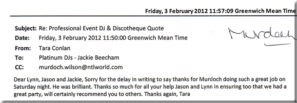 | Dear Lynn, Jason and Jackie, sorry for the delay in writing to say thanks for Murdoch doing such a great job on Saturday night. He was brilliant. Thanks so much for all your help Jason and Lynn in ensuring too that we had a great party, will certainly recommend you to others. Thanks again Tara. | |||||||||||||||||||||||||||||