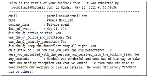 pmcmillan16@hotmail.com name: Pamela McMillan company name: Private Event date of event: May 21 2011 did the dj arrive on time: Yes was the dj polite and courteous: Yes was the dj smartly presented: Yes did the dj keep the dancefloor busy all night: Yes on a scale of 1 to 10 how did you rate the djs performance: 10 were you satisfied with service you received from the booking team: Yes any comments: Murdoch was wonderful and went out of his way to make sure our wedding reception was what we wanted. He even took the time to meet before our wedding to discuss details. We would definately recommend him to others! |