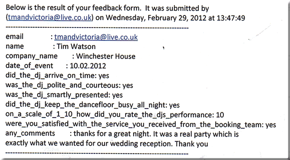 tmandvictoria@live.co.uk name: Tim Watson company name: Winchester House date of event: 10.02.2012 did the dj arrive on time: yes was the dj polite and courteous: yes was the dj smartly presented: yes did the dj keep the dancefloor busy all night: yes on a scale of 1 to 10 how did you rate the djs performance: 10 were you satisfied with the service you received from the booking team: yes any comments: thanks for a great night. It was a real party which is exactly what we wanted for our wedding reception. Thank you. |