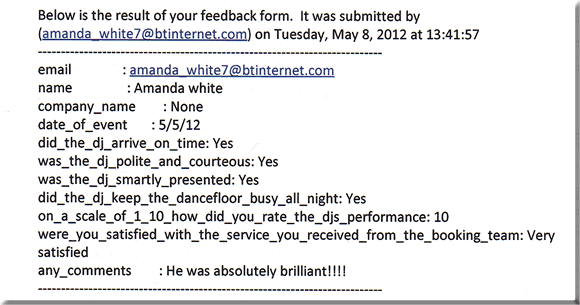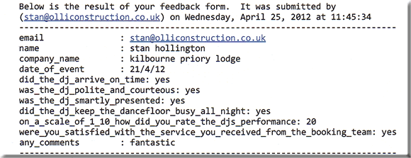 Stan@olliconstruction.co.uk name: stan hollington company name: kilbourn priory lodge date of event: 21/4/12 did the dj arrive on time: yes was the dj polite and courteous: yes was the dj smartly presented: yes did the dj keep the dancefloor busy all night: yes on a scale of 1 to 10 how did you rate the djs performance: 20 were you satisfied with the service you received from the booking team: yes any comments: fantastic |
