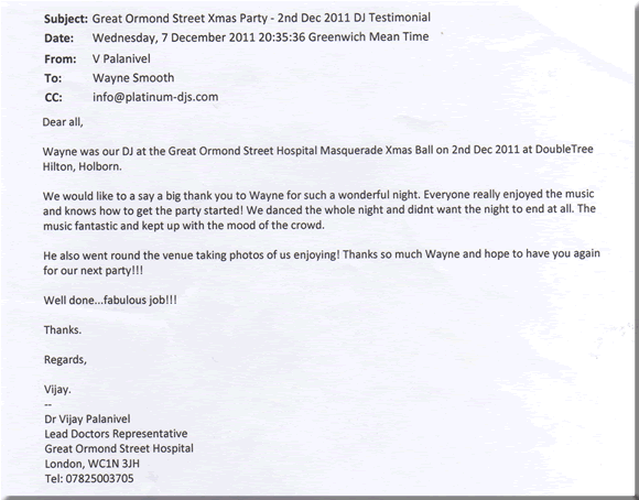all, Wayne was our DJ at the Great Ormond Street Hospital Masquerade Xmas Ball on 2nd Dec at Double Tree Hilton, Holborn. We would like to say a big thank you to Wayne for such a wonderful night. Everyone really enjoyed the music and he knows how to get the party started! We danced the whole night and didn't want the night to end at all. The music was fantastic and kept up with the mood of the crowd. He also went round the venue taking photos of us enjoying! Thanks so much Wayne and hope to have you again at our next party!!! Well done .... fabulous job!!! Thanks Regards Vijay |