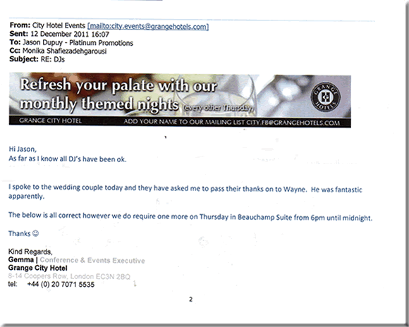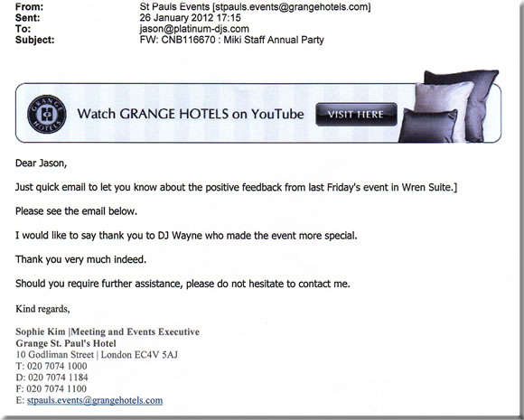 Jason, Just quick email to let you know about the positive feedback from last Friday's event in Wren Suite. Please see the email below. I would like to say thank you to DJ Wayne who make the event more special. Thank you very much indeed. |
