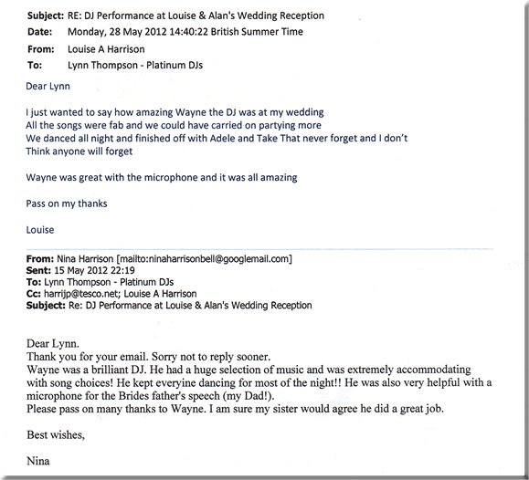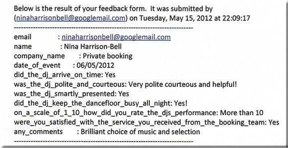| email: ninaharrisonbell@googlemail.com name: Nina Harrison-Bell date of event: 06/05/2012 did the dj arrive on time: Yes was the dj polite and courteous: Very polite, courteous and helpful was the dj smartly presented: Yes did the dj keep the dancefloor busy all night: Yes! on a scale of 1 to 10 how did you rate the djs performance: More than 10 were you satisfied with the service you received from the booking team: Yes any comments: Brilliant choice of music and selection |