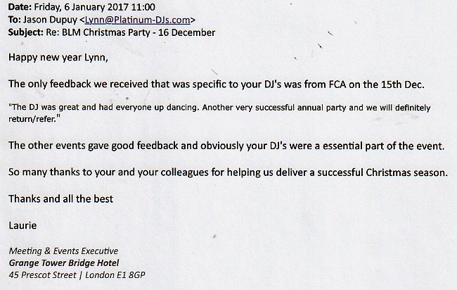 The only feedback we received that was specific to your DJ’s was from FCA on the 15th Dec.