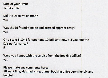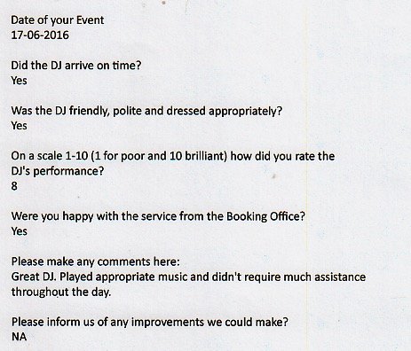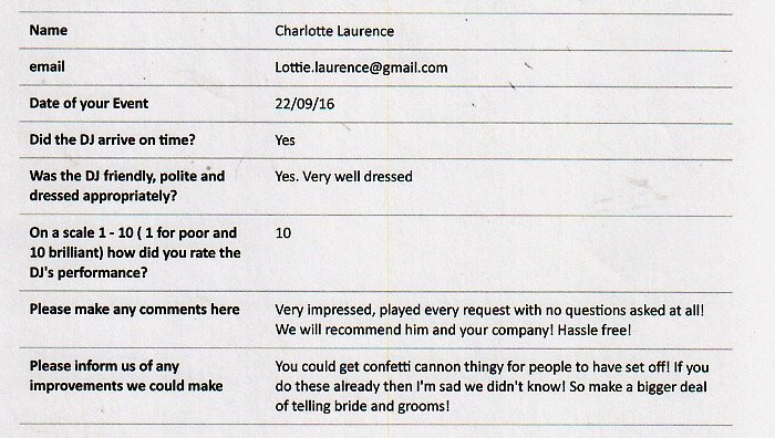 Apologies for late reply just got back from our hols! Just filled in the survey, we are so pleased we had DJ Murdoch for our wedding, he was fantastic, great company and really made our night special. Thanks again!