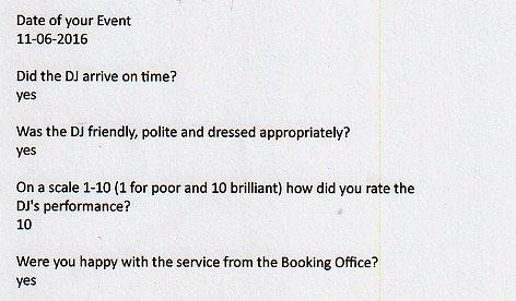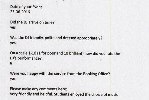 DJ Murdoch was great thanks. Can you send me the receipt for the payment. I need to claim the money back and I can’t do it without a receipt.