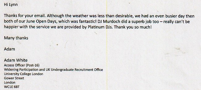 Please make any comments here : Murdoch was a fab DJ and happy to recommend him. In fact, several people wanted him to play on and were suitably disappointed when he couldn’t (venue restrictions). Dealing with Lynn in the Booking Office was wonderful. Smooth, efficient and such a pleasure to liaise with. I’m happy to recommend Platinum DJ’s to anyone looking for an affordable, efficient and professional entertainment service.