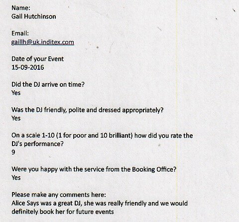 Please make any comments here : Alice was a great DJ, she was really friendly and we would definitely book her for future events.